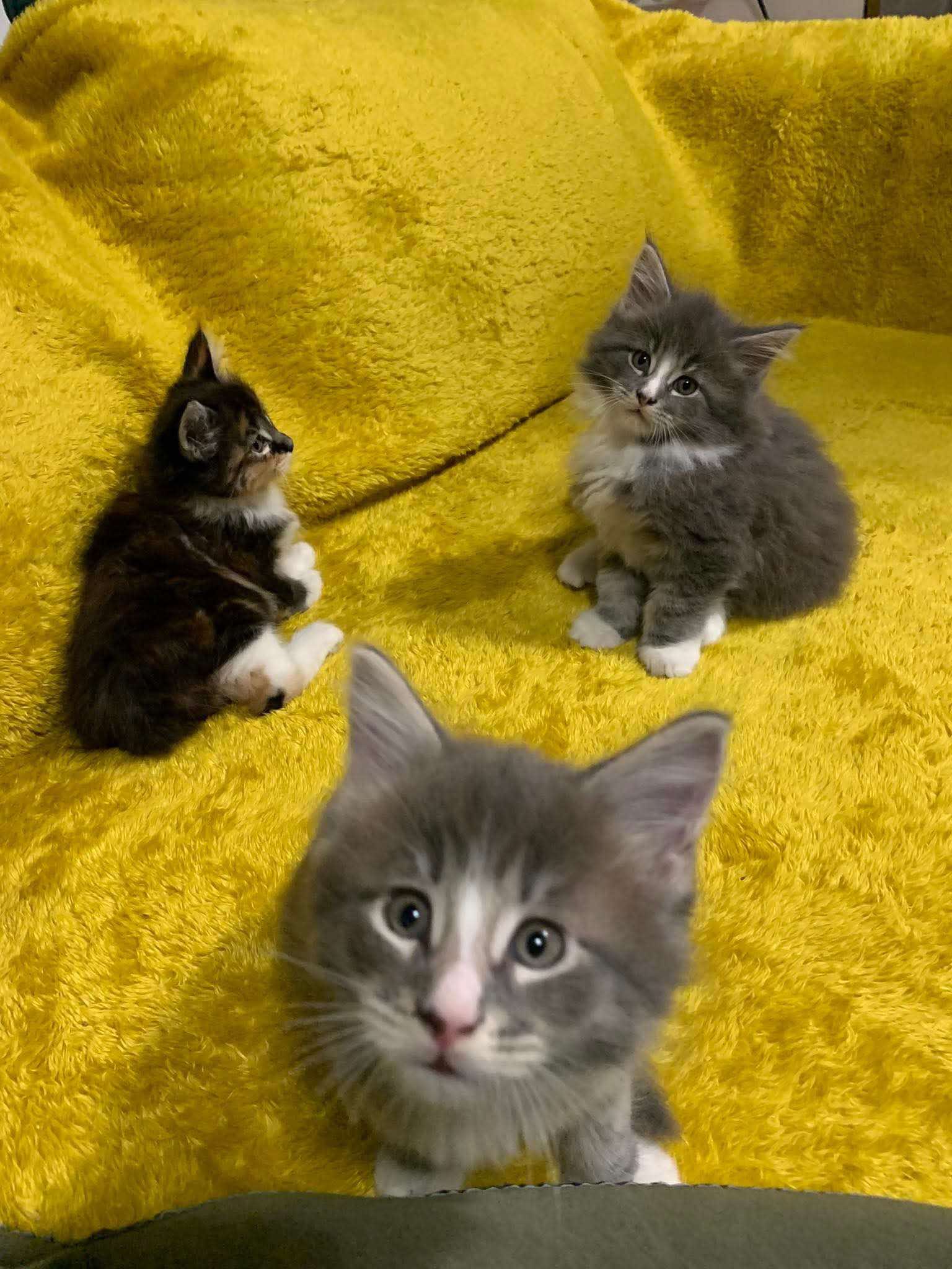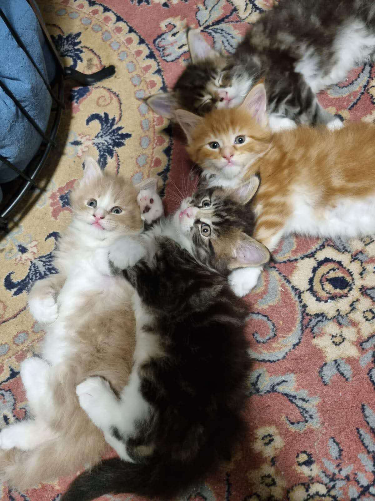 Miot składa się z 2 samców i 2 samic. Samice są trzy kolorowe - na powyższym zdjęciu są to pierwsze dwie kotki od lewej strony (szylkretka i tricolor niebieska), zaś samce to dwa koty na zdjęciu od prawej strony (ciemny pręgowany i rudo-biały)Wszystkie kociaczki posiadają białe brzuszki i białe skarpetki.